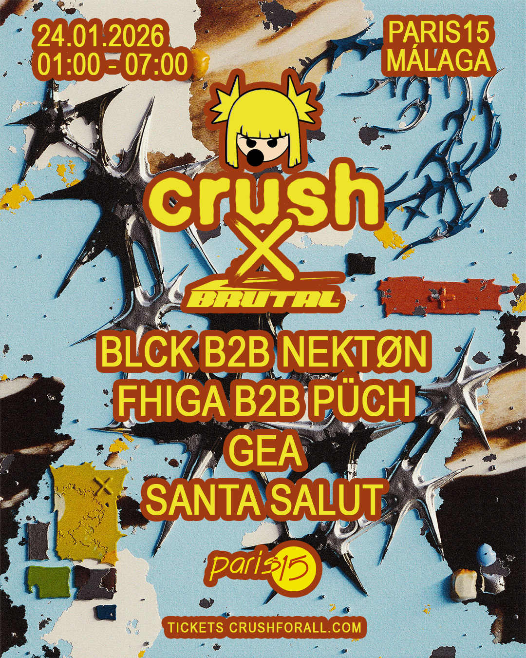 La fiesta Crush, donde el hard techno con influencias más pop y del euro dance europeo celebra su cuarta edición el 24 de enero. En esta edición se unen al colectivo de Granada, Brutal, con un cartel encabezado el b2b de los djs Blck y Nektøn, el madrileño Püch b2b con Fhiga y desde Barcelona Gea y Santa Salut.